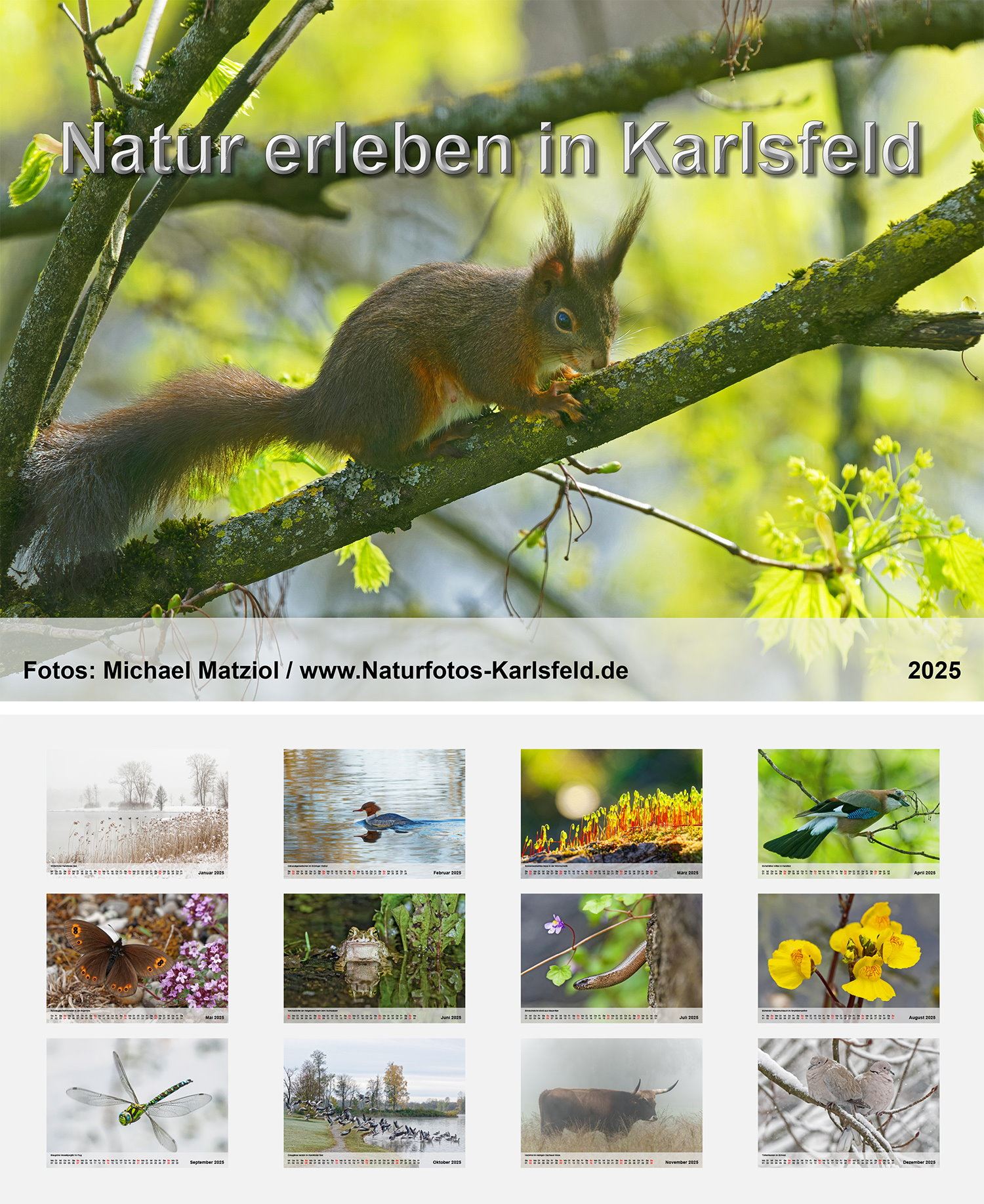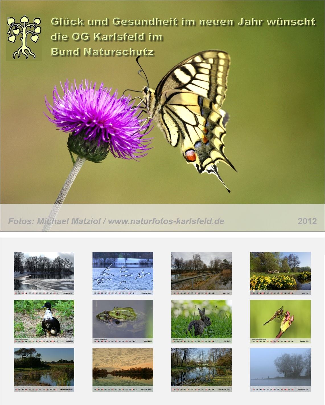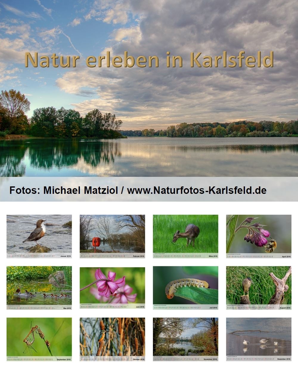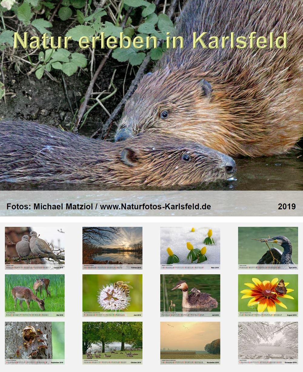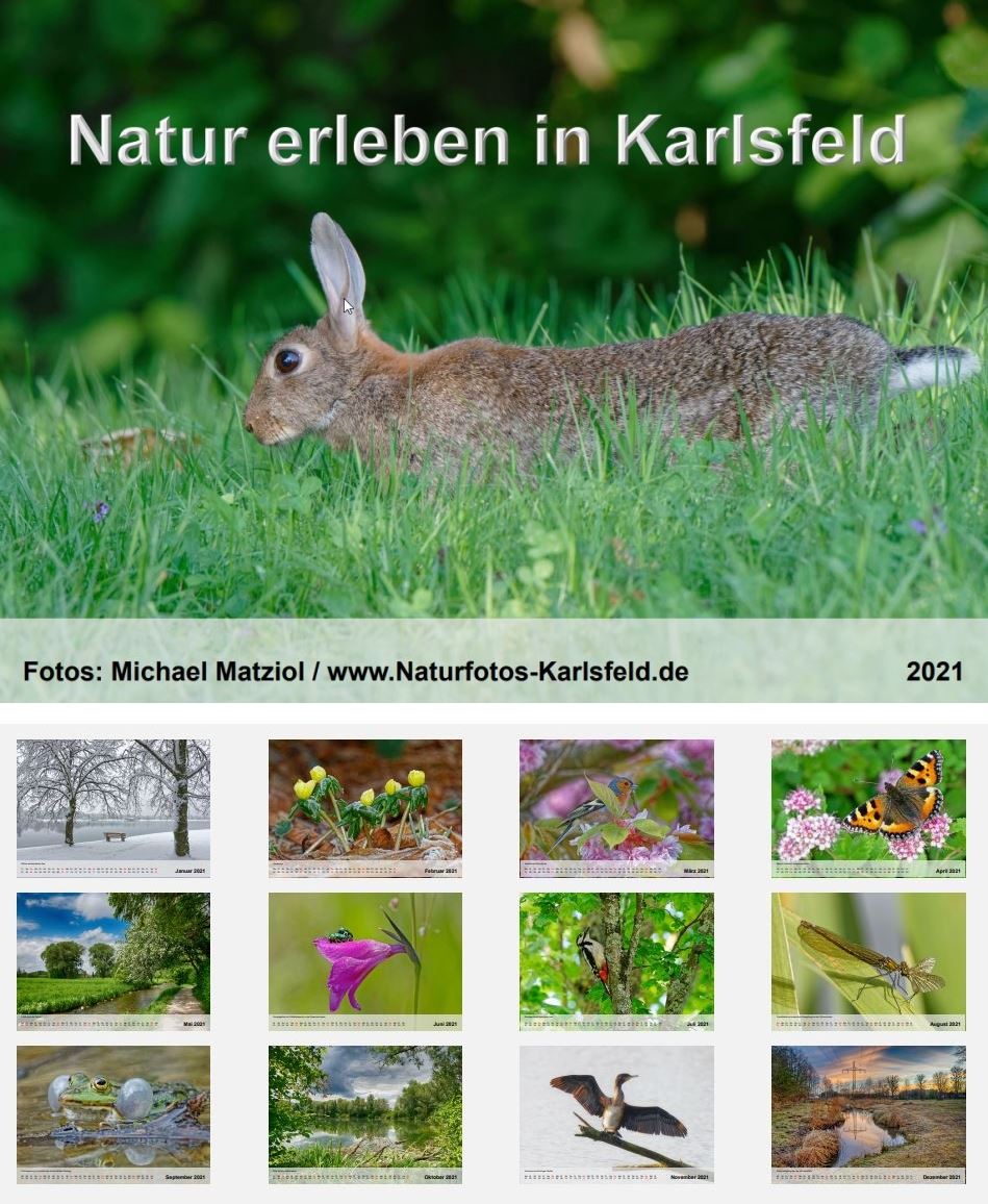 "Naturbilder schaffen Naturverständnis" sagt Willi Rolfes, und er hat recht. Hier zeige ich Tiere, Pflanzen und Landschaften, die ich im Laufe des Jahres überwiegend in Karlsfeld und manchmal auch der nahen Umgebung aufgenommen habe. Es ist ein Projekt, das mir sehr am Herzen liegt und deswegen gebe ich den Kalender zu Eigenkosten weiter.